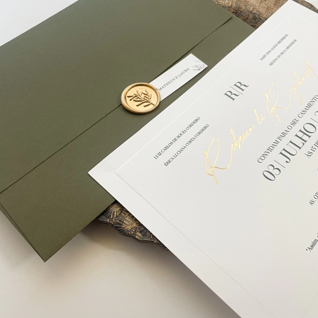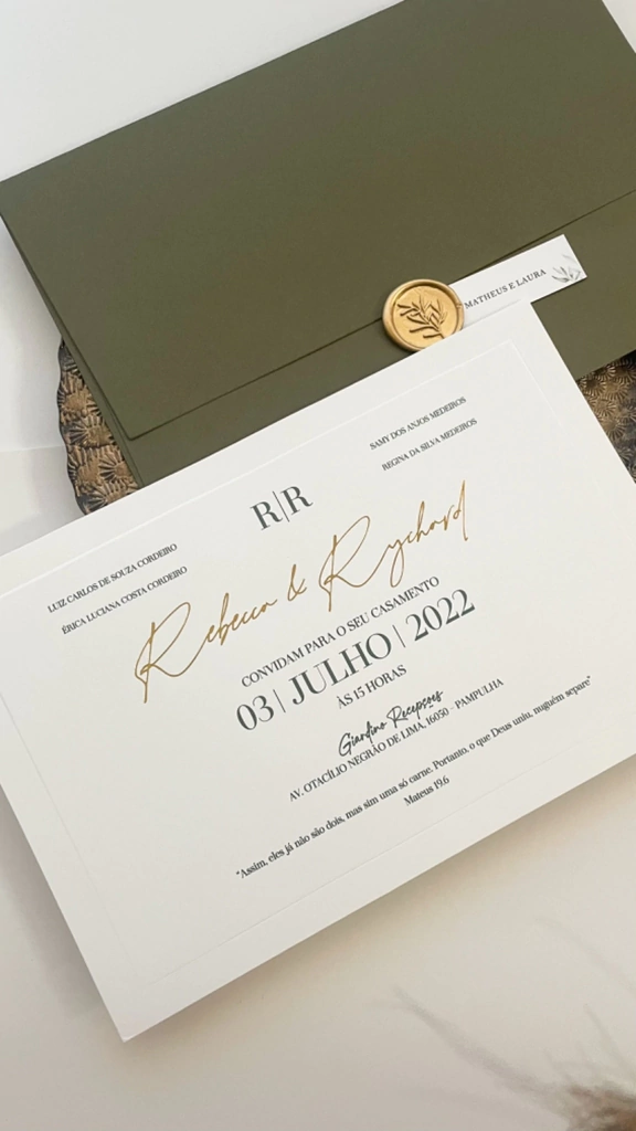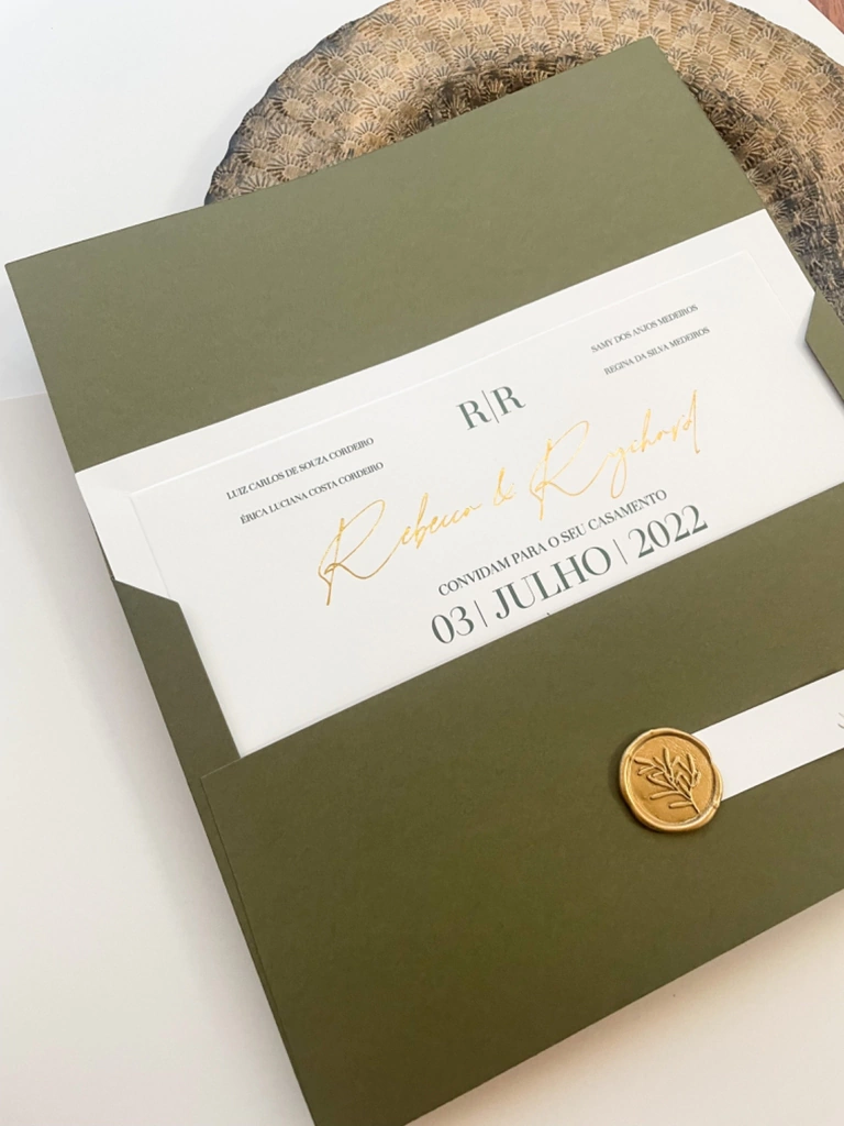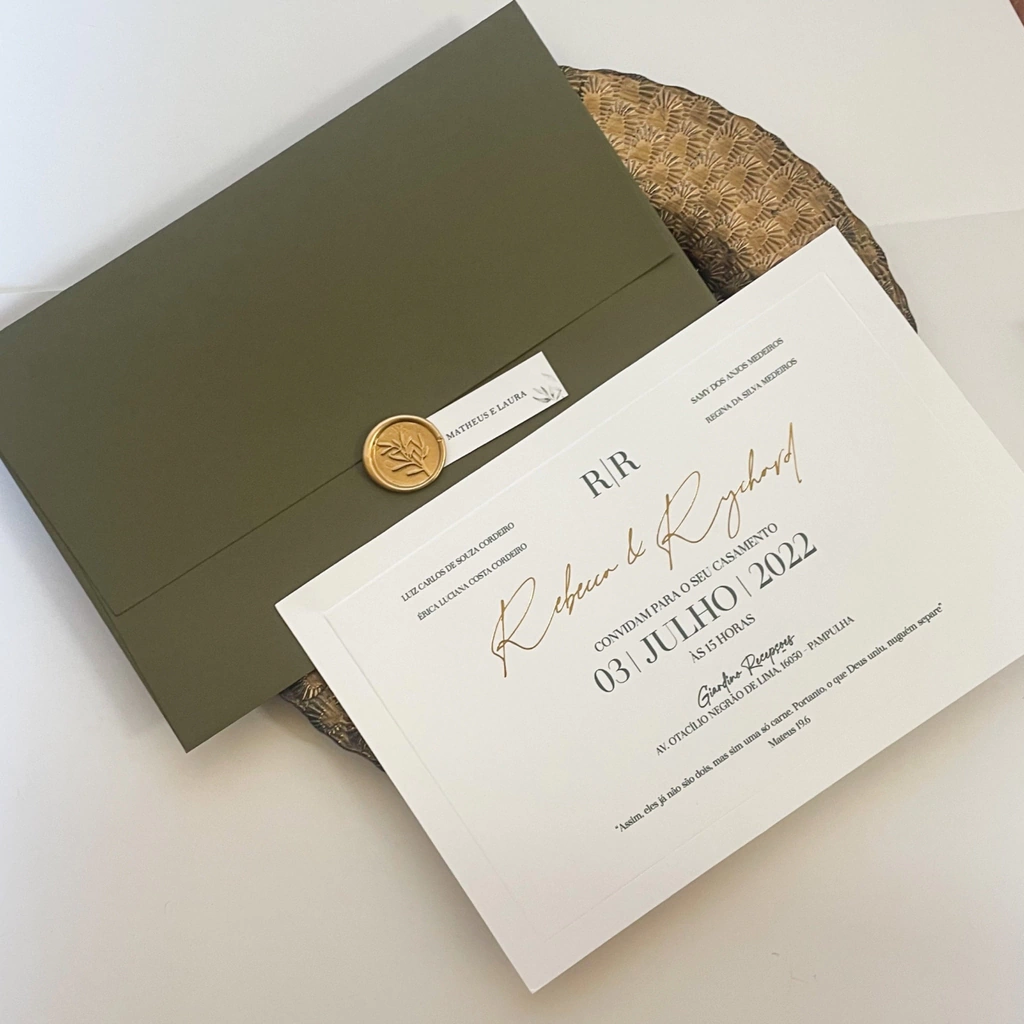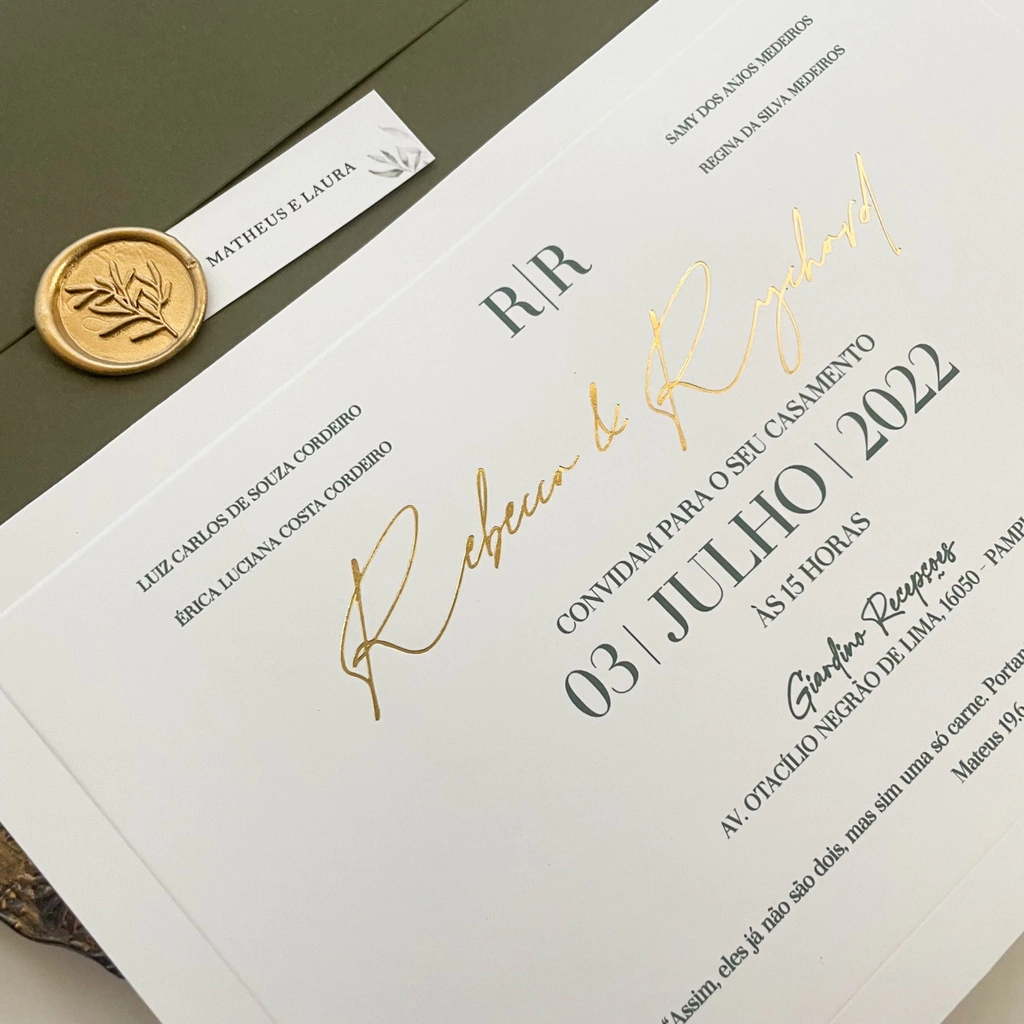 - CONVITE: Papel Opalina 240g, com borda almofada funda e hot stamping no nome dos noivos.