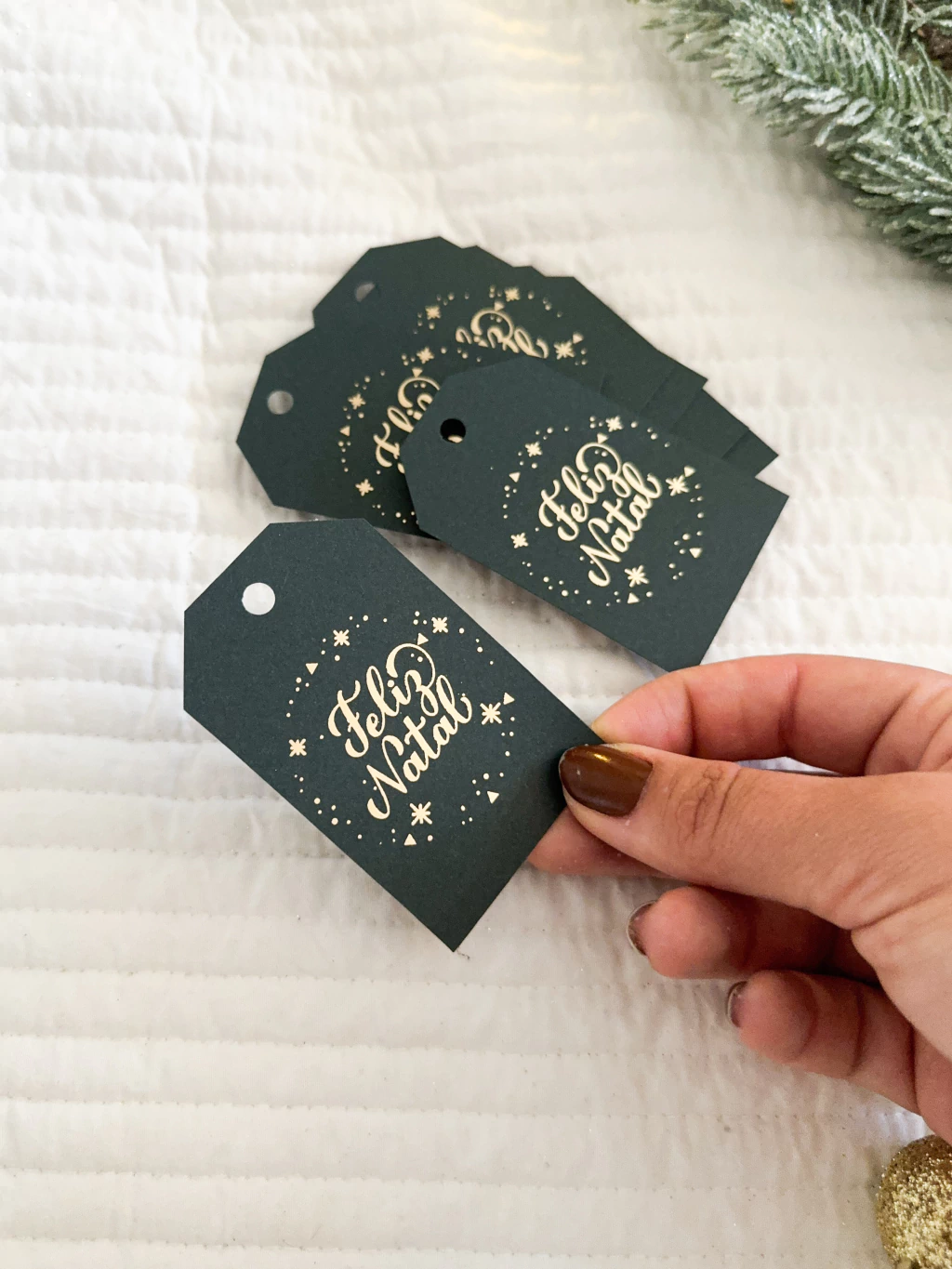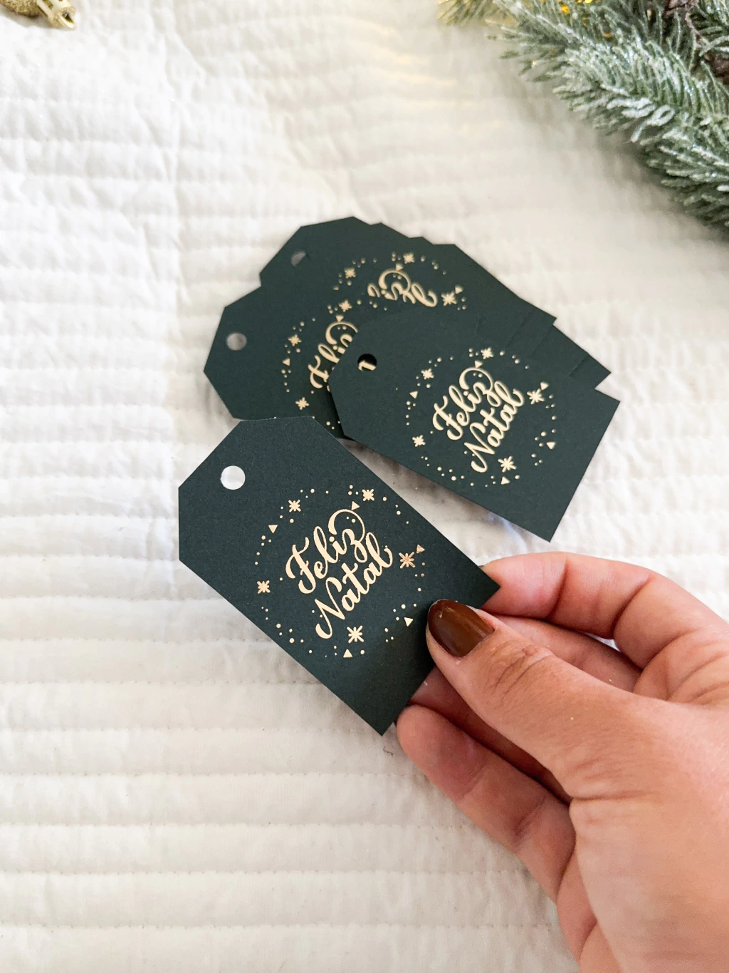 - Impresso em papel Color plus 180g (verde escuro), Fcard Vermelho 180g (marsala) ou Marfim 180g (marfim) e acabamento com laminação dourada.